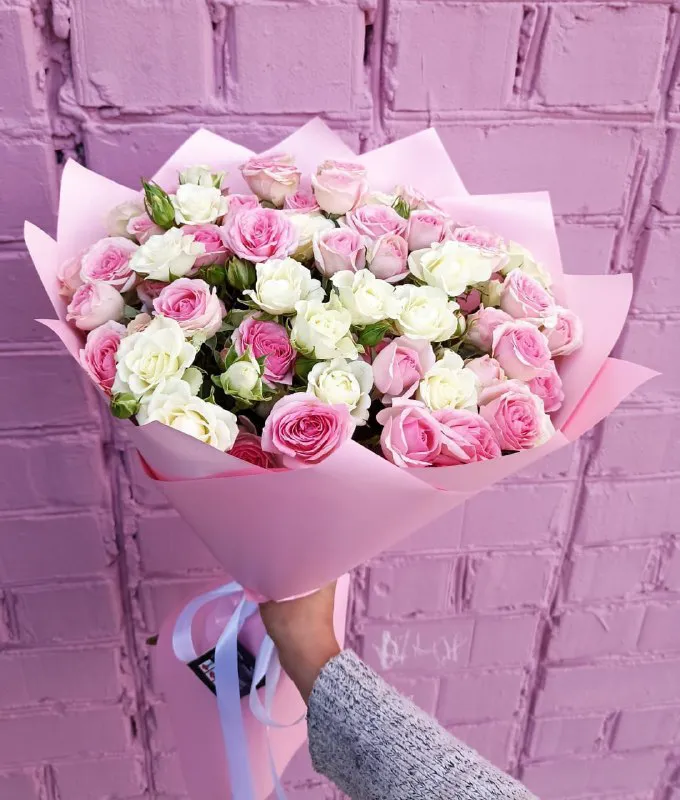 Роскошный букет из нежнейших белых и розовых  кустовых роз подходит  для подарка в  День Рождения, Юбилей, 8 Марта, свидание,  День Матери, 14 февраля.