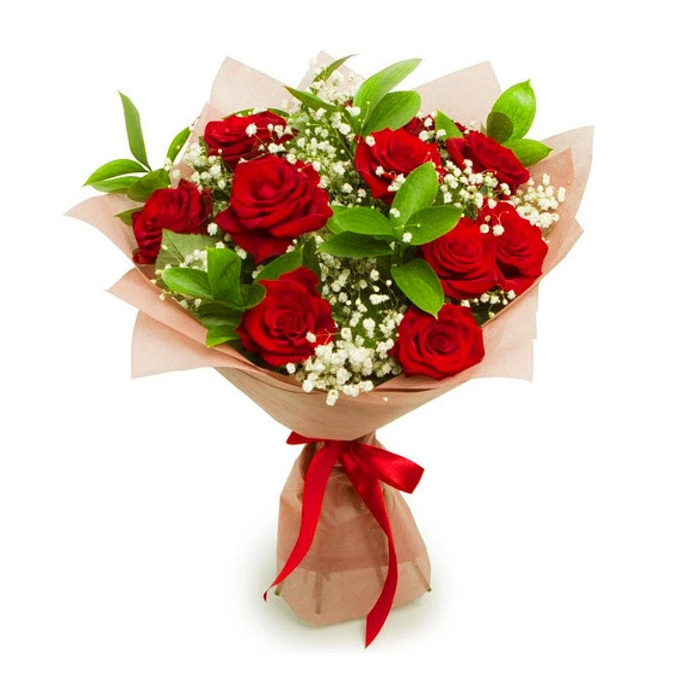 • Средний - красная роза - 11 шт., гипсофила, зелень, крафт, упаковка, лента