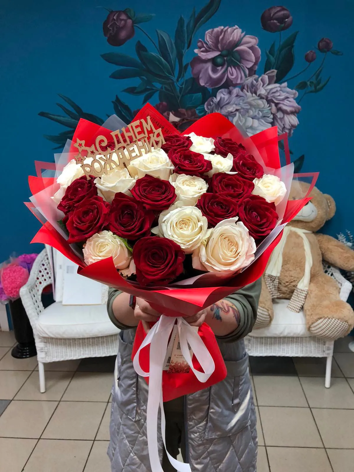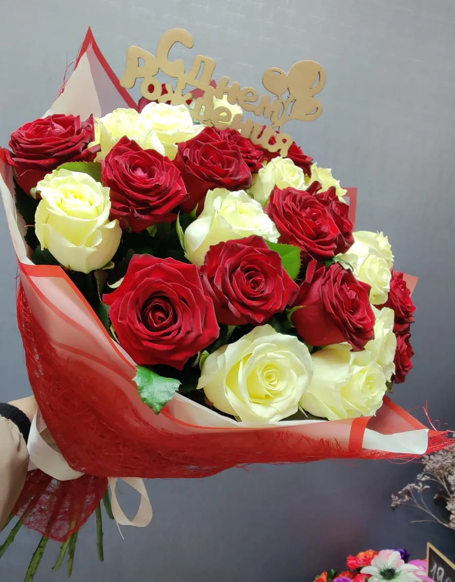 Состав букета: красные и белые розы, зелень,топпер,упаковка,лента