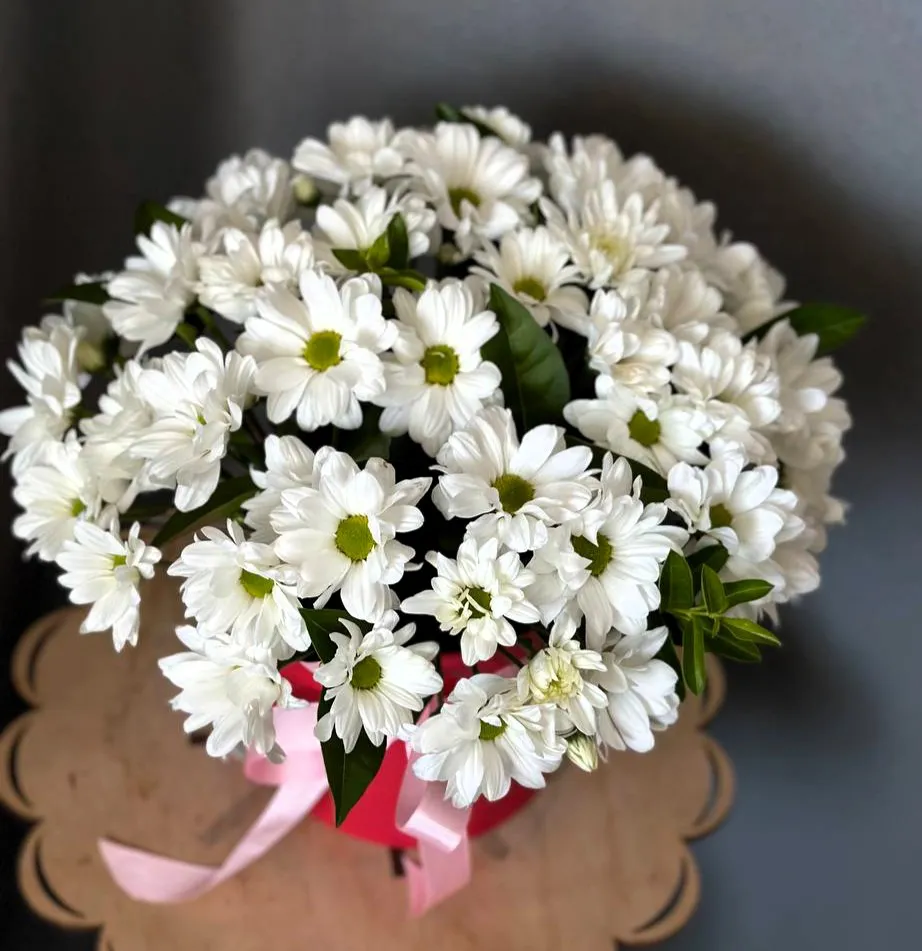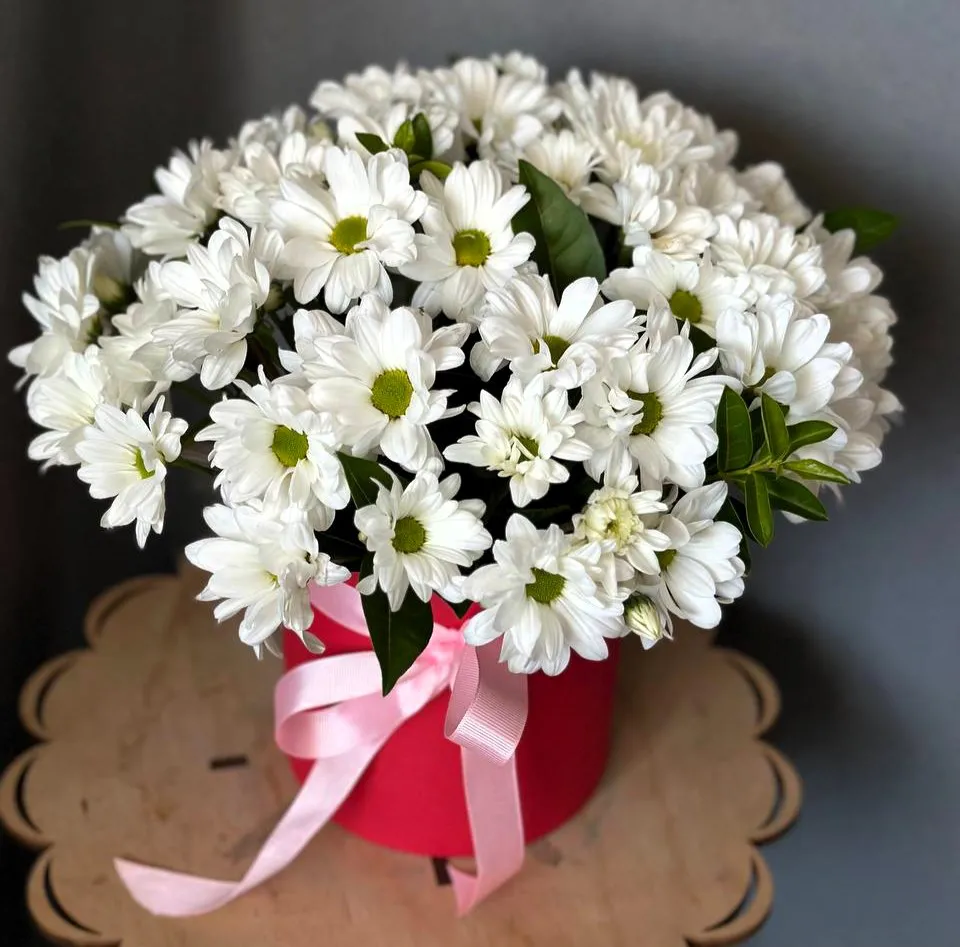 Шляпная коробка, наполненная белыми ромашковыми хризантемами, — это настоящее произведение искусства, способное украсить любое пространство и поднять настроение. Каждая хризантема, словно маленькое солнышко, излучает светлую и чистую энергетику. Их бархатистые лепестки нежно переливаются на свету, а серединки, насыщенные желтым цветом, создают эффект солнечных лучиков, объединяющих гармонию и радость.