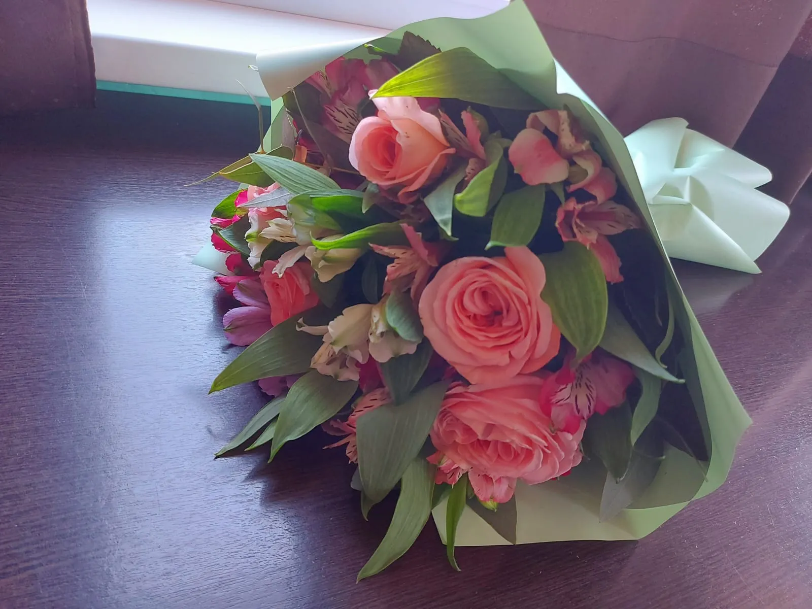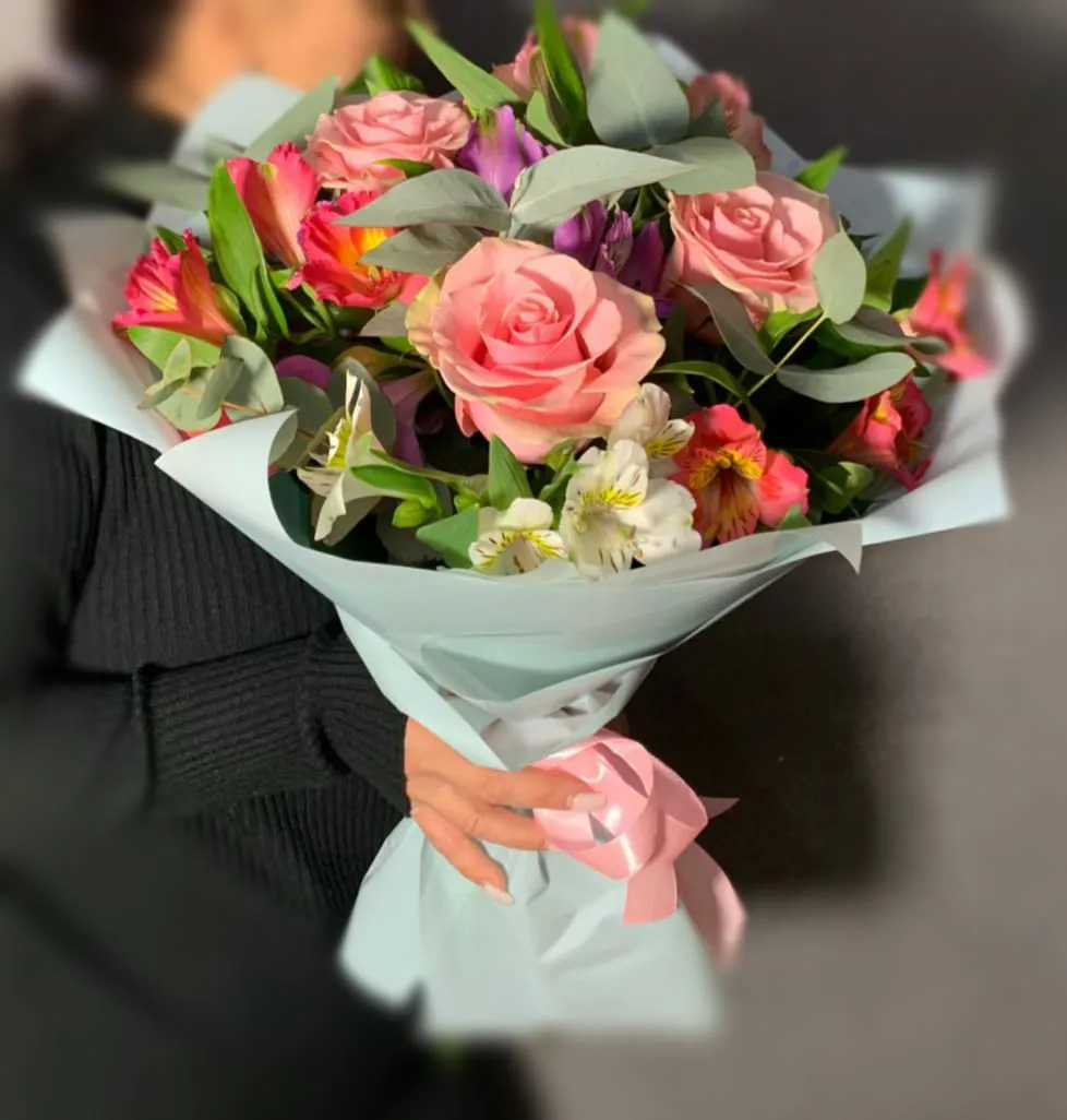 Состав букета: розы ,альстромерии, зелень, упаковка, лента