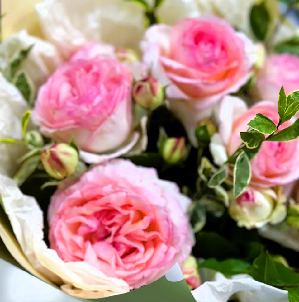 пионовидные одноголовые розы, зелень, упаковка,лента