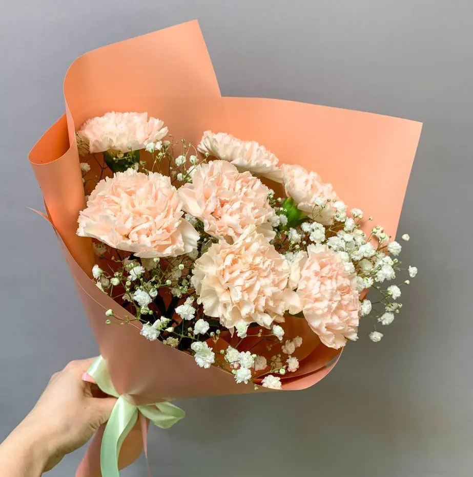 Гипсофила, будто облачко легкого тумана, придает композиции воздушность и игривость, добавляя нотки нежности. Мягкие белые цветочки, усыпанные между гвоздиками, создают контраст и делают каждый элемент букета более выразительным.
