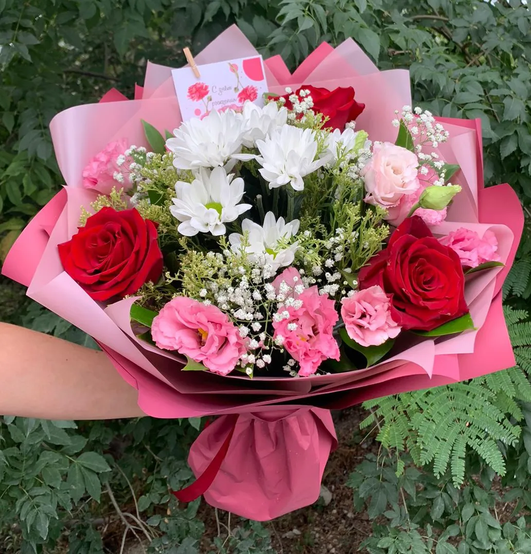 • Средний - роза - 5 шт., Эустома - 3 шт., хризантема - 2 шт., гипсофила, упаковка, лента