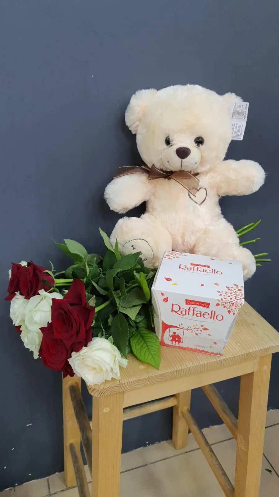 Букет из роз, мягкая игрушка 25 см и коробка Raffaello 150 гр.